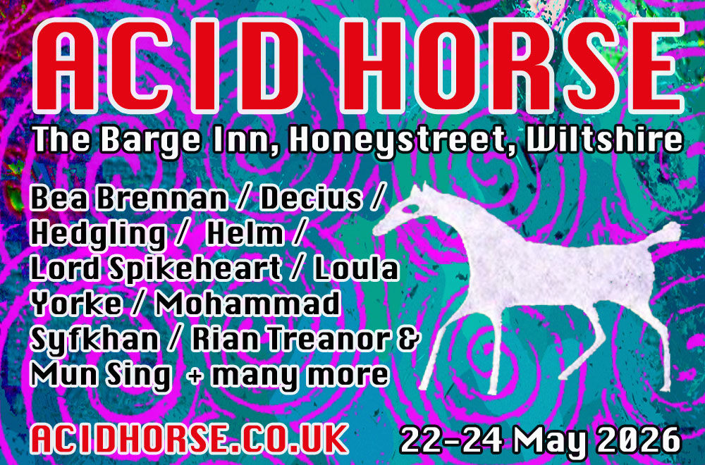 Acid Horse, the festival co-organised by tQ’s own John Doran (with Mark Pilkington of Strange Attractor Press) has been announced for the Whitsun bank holiday weekend May 2026, with a wide ranging line up spread over three days and two stages.