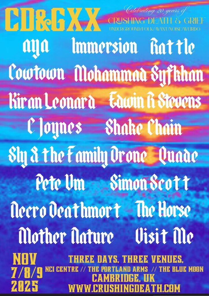 Crushing Death & Grief may or may not be a former late 20th century violent direct action paramilitary group from West Germany who went into hiding in the south east of England – although the wise money is on “not”. Either way, over the last 20 years they have been responsible for, in their own words “gigs in Cambridge, gigs in East Anglia. No messing.” And their list of shows looks like a complete record of all the music we’ve covered here at the Quietus after you take Erasure and OMD off the list.