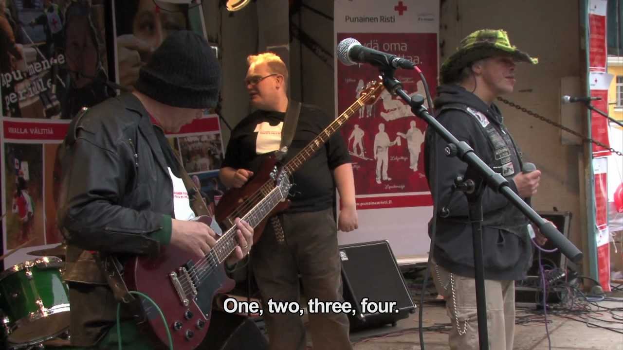 As the film shows, the band’s gigs are, in short, phenomenal: arriving onstage at Vindicat, Groningen’s grottiest venue, the band proceeded to power through a set of straight-ahead three-minute shards of vitriolic punk, delivered with sheer conviction and unbridled feeling. Frontman Kari Aalto stands almost motionless at the front of the stage, delivering his lyrics in a determined speak-sung vocal, while Sami Helle commands the band from his bass, holding down the entire band. There’s no hint of posturing, no archness to the image; the music is just fervently drawn from the heart.