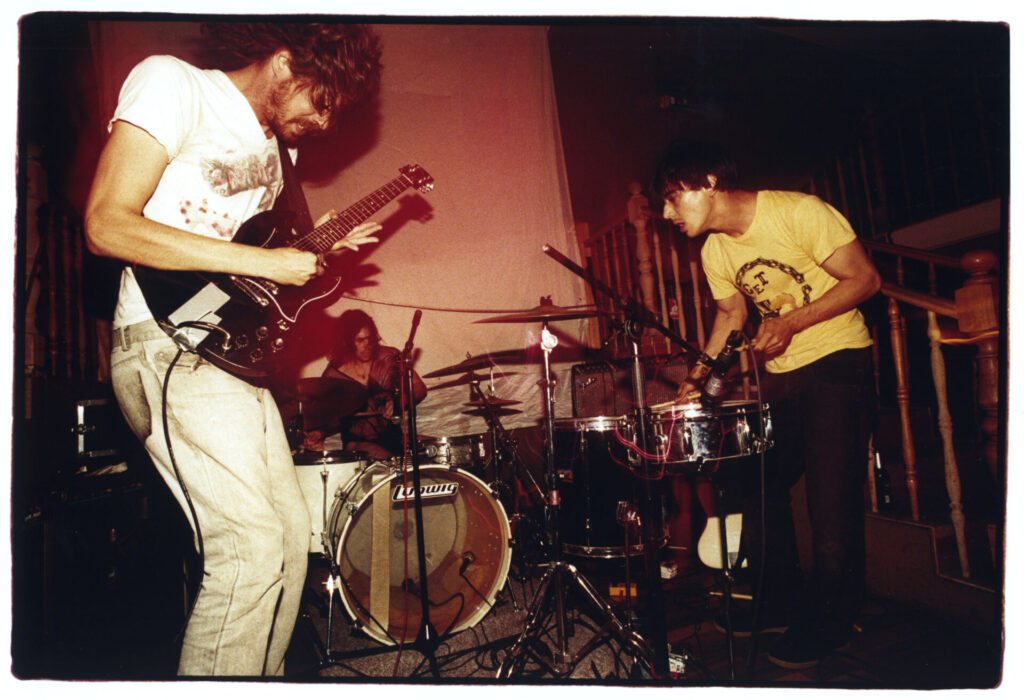 What many missed was how their experimental tendencies and embrace of noise and punishing rhythm was never tediously academic or austere. There was a loose madness to it all, the haze of bong paranoia and, live, astonishingly intense performance and a desire to put on a show. My memory is hazy, but I recall Julian Gross generally wearing a dress, Andrew sometimes all in white or in a shirt and tie below his long face, shaggy hair and moustache, like the accountant at a 70s porn cinema hiding out in the wilds from the mob and the taxman alike, mind disintegrating. Hemphill generally looked like a young rogue genius, too hot for science, directing matters, rattling out on a snare. At that Field Day gig and beyond they were brutal, visceral, hedonistic. Sometimes it was savage, but never antagonistic – his giant frame leaning over the audience, propped up on the mic stand, Andrew was shamanic, a leader, inviting us to join in Liars’ peculiar chant. And of course there was tenderness too. Andrew might have had a bellow on him, but he was always capable of a croon – and it was this is key to Drums Not Dead. Liars could write melodies, they just never saw them as the be all and end all, preferring to experiment with how they might sit in dialogue with the power of the drum, the instrument that was then the starting point for all the band’s compositions.