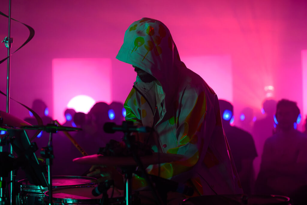 Dancers walking into the premiere of a new live show from C’mon Tigre, dancers could have been forgiven for thinking that they had strayed into a silent disco. They were given headphones and taken behind a curtain into a quiet room to be confronted by LED screens a large band all sporting long white jackets with yellow paint splatters on them. It’s a bit like entering the world of computer game Cyberpunk 2077. South American grooves are injected into the audience’s ears far louder than in the room, and I can’t resist switching between the two – the band are excellent, sounding like Glass Beams or Khruangbin, and there’s even a robot percussionist who performs a duet with the live, human drummer.
