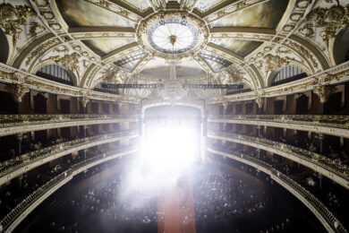 Semibreve’s most impressive space of all, however, is the Theatro Circo. Whereas the basilica, the palace and the seminary are used once each, this is the festival’s central hub, hosting six concerts over three days. It is beautiful, the inner hall and its three storeys of stalls plastered in white gold and rose, an enormous chandelier hanging at the centre of a neo-baroque cupola – and yet the acts that respond most effectively to the space – Suzanne Ciani and Actress in a collaborative show – do so by stripping those frills and focussing on pure geometry. Standing opposite one another, Ciani behind a tangle of wires on her modular set-up, Actress behind a laptop, they deploy a quadraphonic surround sound set up so that the immense waves of noise they create whirl around and around the circular building. To hear it is to be placed into the centre of a sonic hurricane, witnessing its eyewall sparkle, pop, throb and pulse, accelerate and decelerate in pace, swell in size and recede. At times the whirl has a deep groove, and at others a shredding intensity. It is a shame that the pair are dogged by technical issues towards the end, for when it was within their control, this is as staggering a sound as can be imagined.