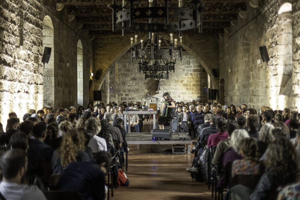 Then there is the episcopal palace in the centre of the old town, a mish mash of the original medieval structure, later expansions, and repairs after a 19th century fire, and which now belongs to the University of Minho which was founded in the 1970s. In one of its older halls, the Lebanese multi-instrumentalist Yara Asmar performs her project Stuttering Music, which encapsulates, like this collaged space, the fact that what appears fixed on the surface is often the result of fragmentation – albeit through the lens of her personal and familial history. Playing an accordion that once belonged to her grandmother, the instrument wheezes and lurches as she lays down an initial melody. I don’t know if it is an old melody or a new one, but the way Asmar plays it lends a warped and battered beauty that makes it sound as if it has been playing over and over for centuries. Then, she loops the instrument, blending it with electronic drones, glockenspiel (which she strikes traditionally for a chiming melody but also scrapes with a violin bow to create a haunting finger-on-wine-glass swoop) so that they mesh together into a fluid and ever-shifting whole. Sometimes the accordion and glockenspiel are so manipulated that they become detached from their sources, almost unrecognisable as the products of those instruments, but at others it’s the opposite, earthed in the clangs of metal and the creaks of wood and leather that she wields.